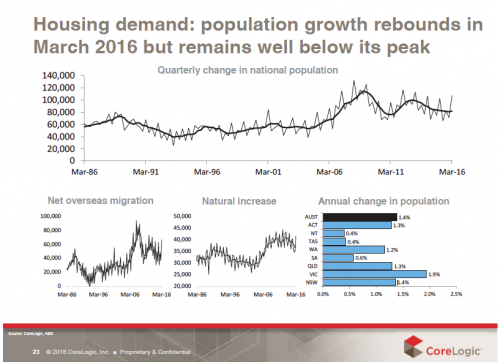 Queensland is also recording the fastest population growth in 15 months. After our population growth trended back in recent years it is great to see our population growth trending upwards again. It stated that while tourism and agricultural exports will provide momentum in QLD economy it is also encouraging seeing higher coal prices boosting our state’s reserves. The graph below shows the population growth nationally which is also showing a rebound in population growth in March 2016 although below the previous peak yet still at high levels.