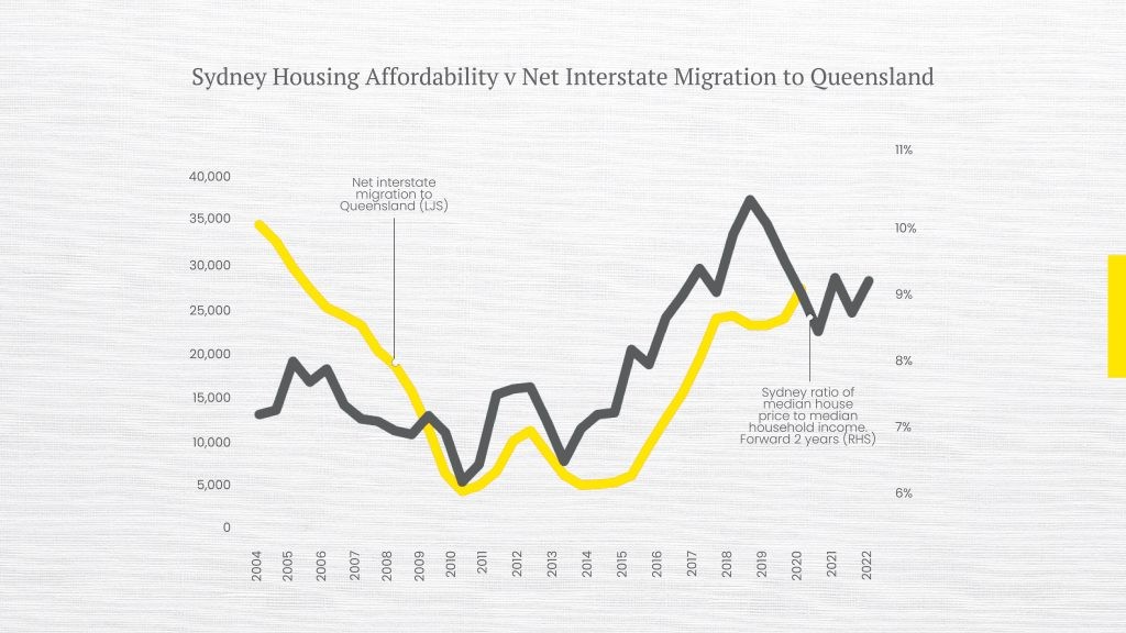 Below is a chart from Matusik research that shows there is a strong connection between high housing costs in the city of Sydney and the positive net interstate migration to Queensland. This is just one confirmation of what I have been discussing today.
